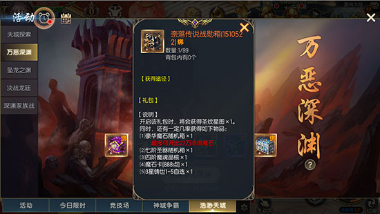 极速传送:刷新后,本服神选者点击【活动主界面-奈落头像】即可直达;身处浩渺天域的神选者,也可直接与【万恶深渊守望者】对话传送,拒绝跑图,上线即战!