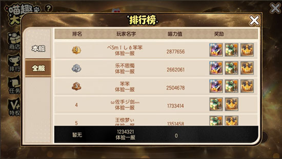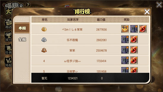 排行榜设立全球榜与单服榜,喵力越高,存活时间越久,排位越靠前,奖励越丰厚!