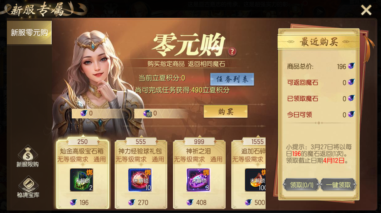 活动期间,神选者每消费1点魔石,即可同步获得1点立夏积分,即便在零元购界面消费的魔石不记入累计消费,也能正常获取积分,加速返还进度。温馨提醒:新服零元购活动结束后,未及时领取的返还魔石,将通过邮件返还二分之一,各位神选者务必及时领取,切勿错过专属福利,可先行购入心仪豪礼,静待积分达标解锁全额返还!