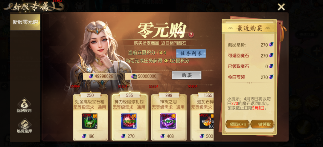 新服零元购可免费拿下4阶圣器自选箱、星芒之火至尊包、灿金高级宝石箱等核心养成材料;