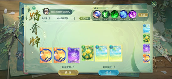 选择你的技能,使用“风”、“花”、“雪”、“月”4种踏青牌完成组合赢取分数,用春之息浇灌运财树,即有机会获得丰厚奖励!