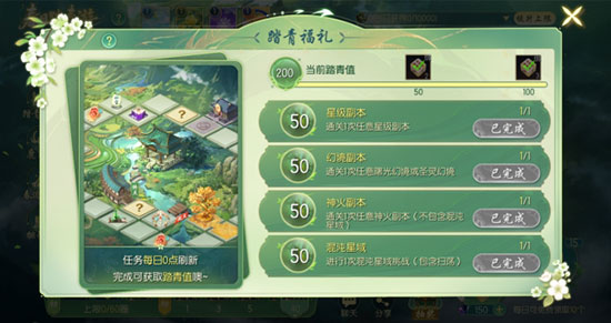 完成“踏青福礼”中的各个目标任务,收获踏青值,获取奖励。